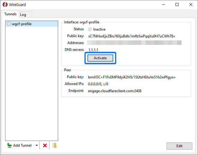 이 파일을 WireGuard에서 불러와 Activate 하면 PC에서 WARP를 사용할 수 있습니다.