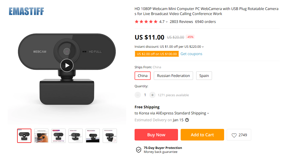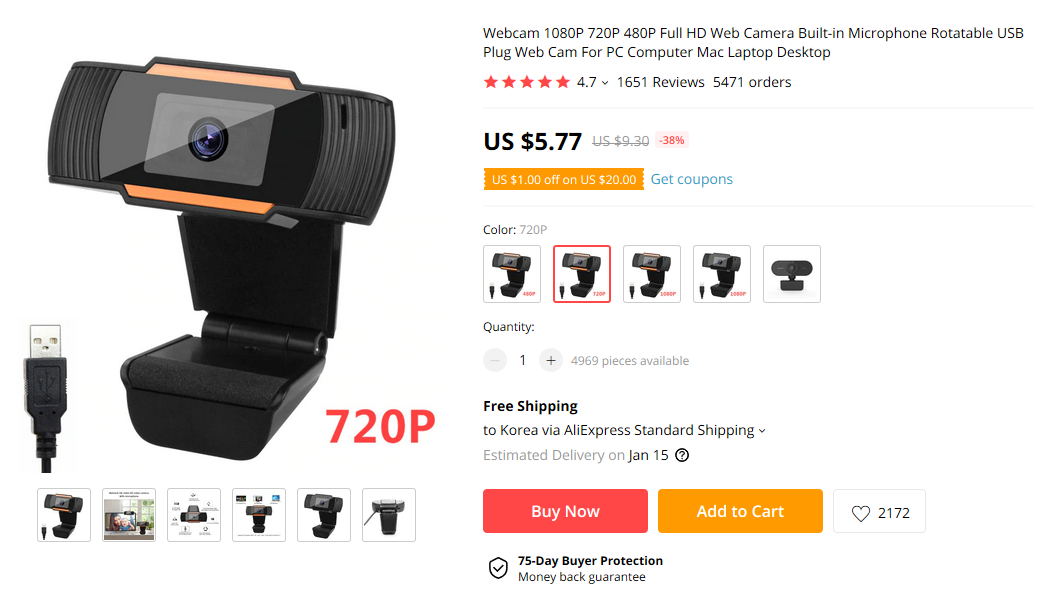 동일한 디자인, 동일한 1080p 해상도 제품이 11달러에 팔리고 있다. 큐캠 제품은 최저가 3.3만원 정도이다. 이건 좀.